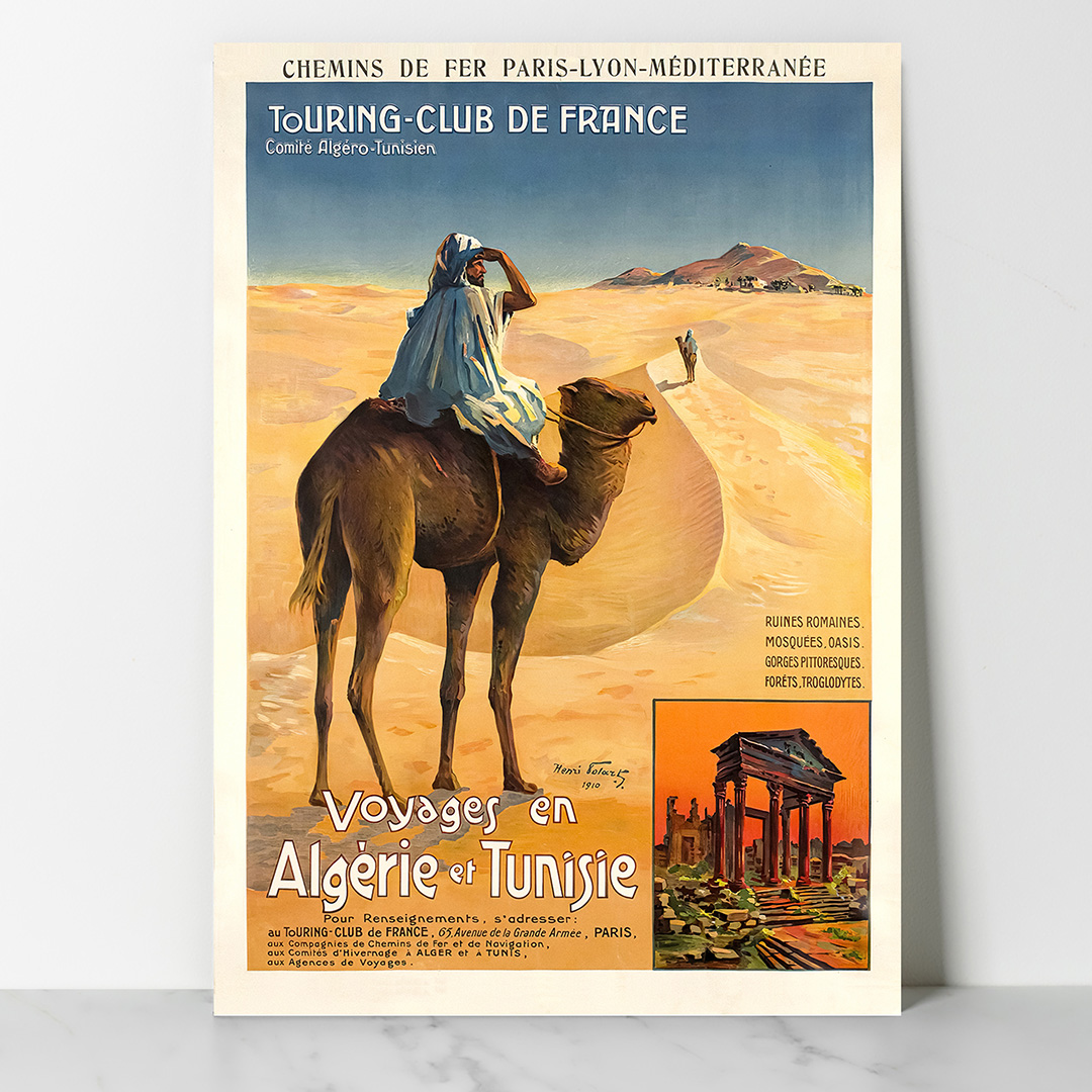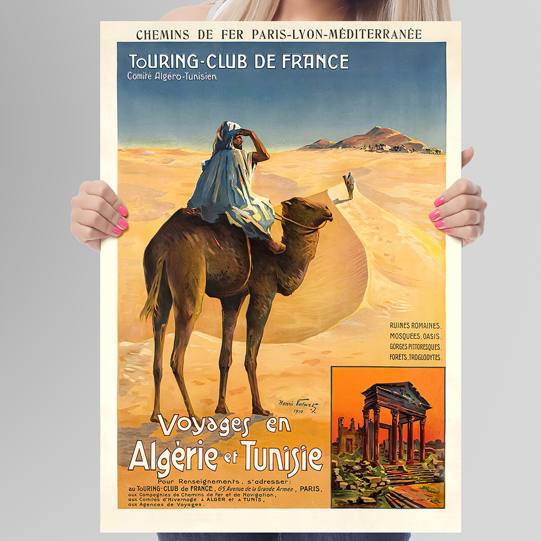 Découvrez l’authenticité de la Belle Époque à travers cette affiche Algérie vintage décoration murale, signée Henri Polart en 1910 pour le Touring Club de France. Véritable chef-d’œuvre de l’illustration publicitaire, cette affiche historique invite à l’évasion entre l’Algérie et la Tunisie, deux joyaux du Maghreb mis en lumière par l’art du voyage du début du XXᵉ siècle.