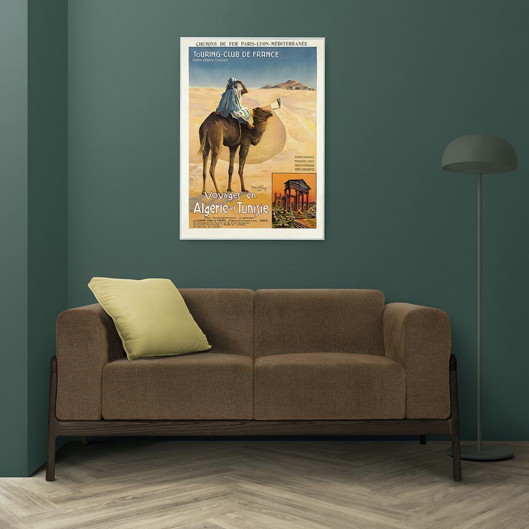 Sur cette affiche Algérie vintage décoration murale, un voyageur monté sur un chameau domine un paysage saharien, baigné d’une lumière dorée. À l’arrière-plan se devinent les dunes, les ruines romaines et les oasis évoquées dans le texte de l’affiche originale : mosquées, gorges, forêts, troglodytes… Henri Polart capture toute la richesse culturelle et la beauté naturelle du Maghreb à travers un style lithographique fin, typique des affiches de voyage Art Nouveau.